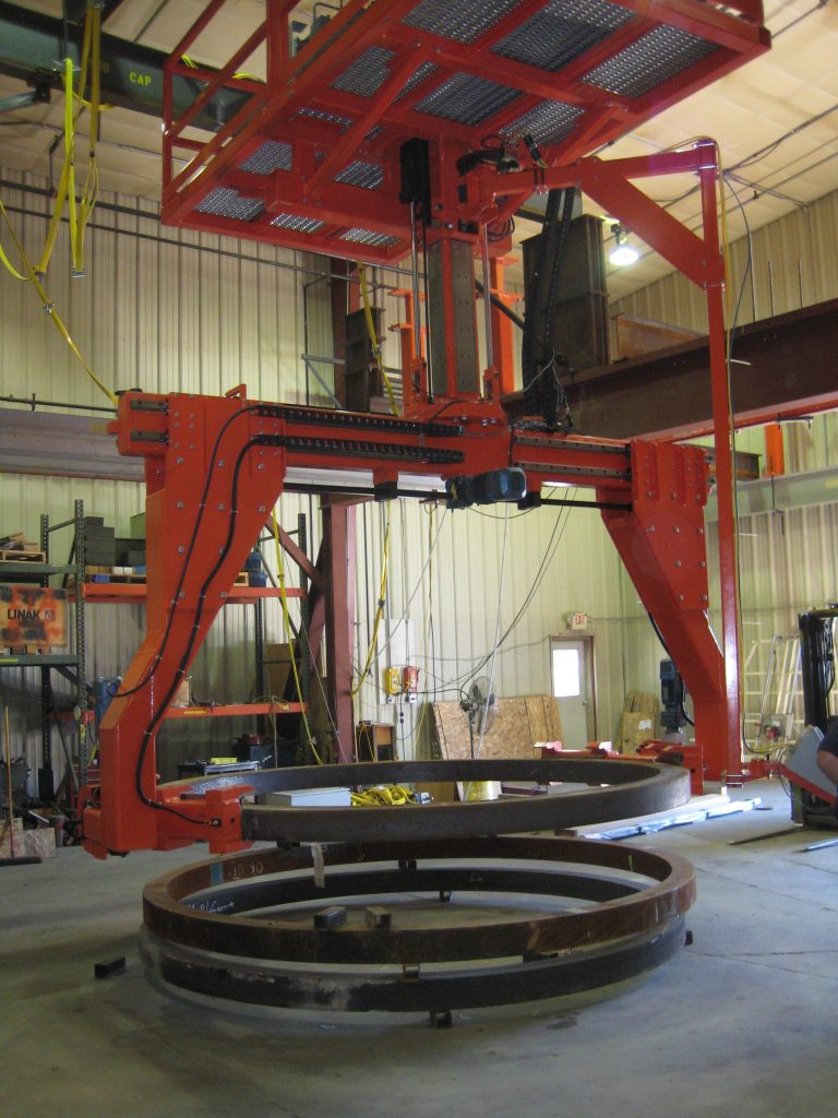 Positech has designed a Ring Cell Manipulator that rides on a gantry system. The Manipulator has all axis measured so it can pick the ring from stack and then an operator picks a VTL that needs to be loaded and holds a control and follows the vertical lift while it drives to the VTL that has been defined.