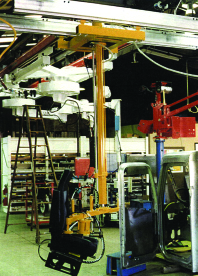 The system capacity rating must be able to accommodate larger oil pans that may be manufactured at a future date. The radial reach and capacity requirements create significant moment loads. Work Cell contains obstructions and low headroom.