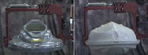 The same end-effector must pick up both the hull and deck, distinctly different weights and sizes of parts. A vacuum end-effector will not work, because of the lack of consistent surfaces between the variety of parts and proven marring by vacuum cups. The products are quite large, limiting the operators ability to easily see the backside of the part when actuating grip.