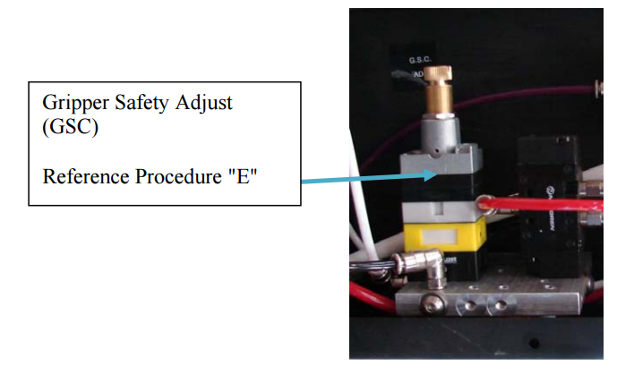 - Make sure the area around the arm (tooling) is unobstructed when you move the mechanical payload (test weight) to about 6 inches above a suitable set-down surface. Push and hold the RELEASE/RELEASE PROOF push button. The arm should lower, but the gripper should not release until the payload is down and supported. If the lower speed is not satisfactory, adjust the flow control (Bleed Down Speed) so the arm and gripped load lower at a satisfactory rate when you push and hold the release/release proof pushbutton. If the gripper opens before the load is adequately supported, unscrew the steam on the GSC Ajd. a small amount to change the sensitivity. Repeat as much as necessary, but you will reach a point where the gripper will not function when it is empty. Therefore, you need to make your final adjustment so the gripper operates when in mid-air and empty and doesn't operate when the arm is moving down with a gripped load. Once you verify that the gripper won't drop a load in mid-stroke, you can test with the the gripped load higher than 6 inches above the support surface.