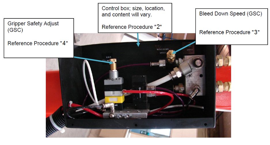 - Remove the cover of the control box (typically a 4" x 6" by 12" to 16" long box mounted on the manipulator) and locate the control valve tagged as "Bleed Down Speed" and the valve tagged as "GSC Adj."