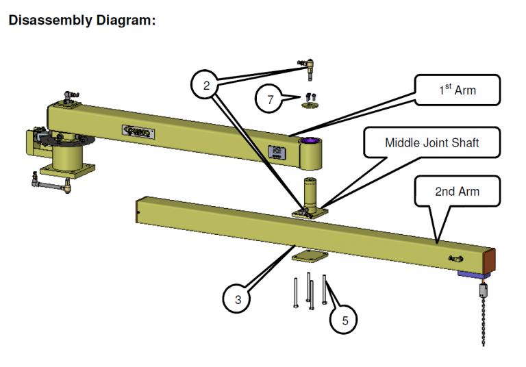 - Loosen and remove the wires and bolts that secure the Middle Joint Shaft to the second arm. Safely lower the second arm from the connection.